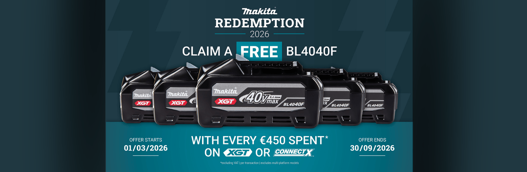 Claim a FREE BL4040F Battery with Makita with EVERY €450 ex VAT spent on XGT or ConnectX products from their range - T&C's apply