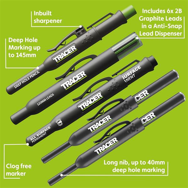 • Includes essential marking tools for construction and trade use: deep hole pencil, clog-free marker, long nib markers, and replacement leads.